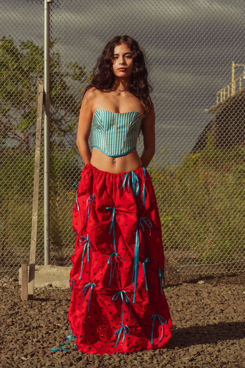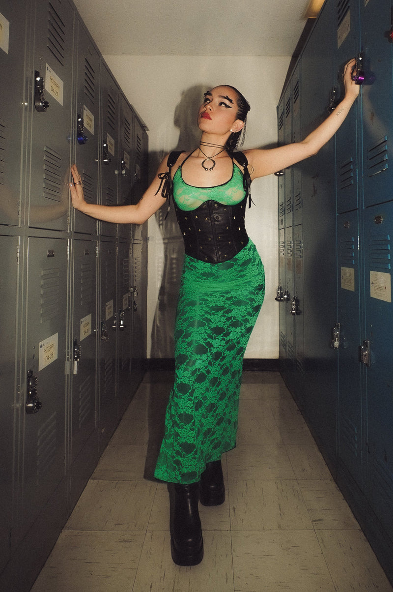 The Gabriella Corset is a strapless corset that falls below the waist. It is laced down the back to close and spiral steel boned along each seam to add reinforcement and flexibility. It has two adjustable lace up details down the front princess lines.