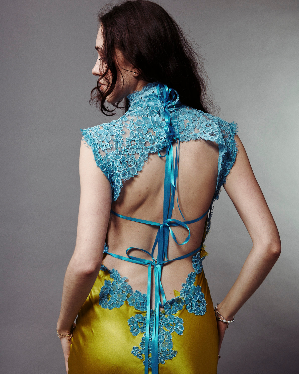 - High neck and open back design with ribbon closure