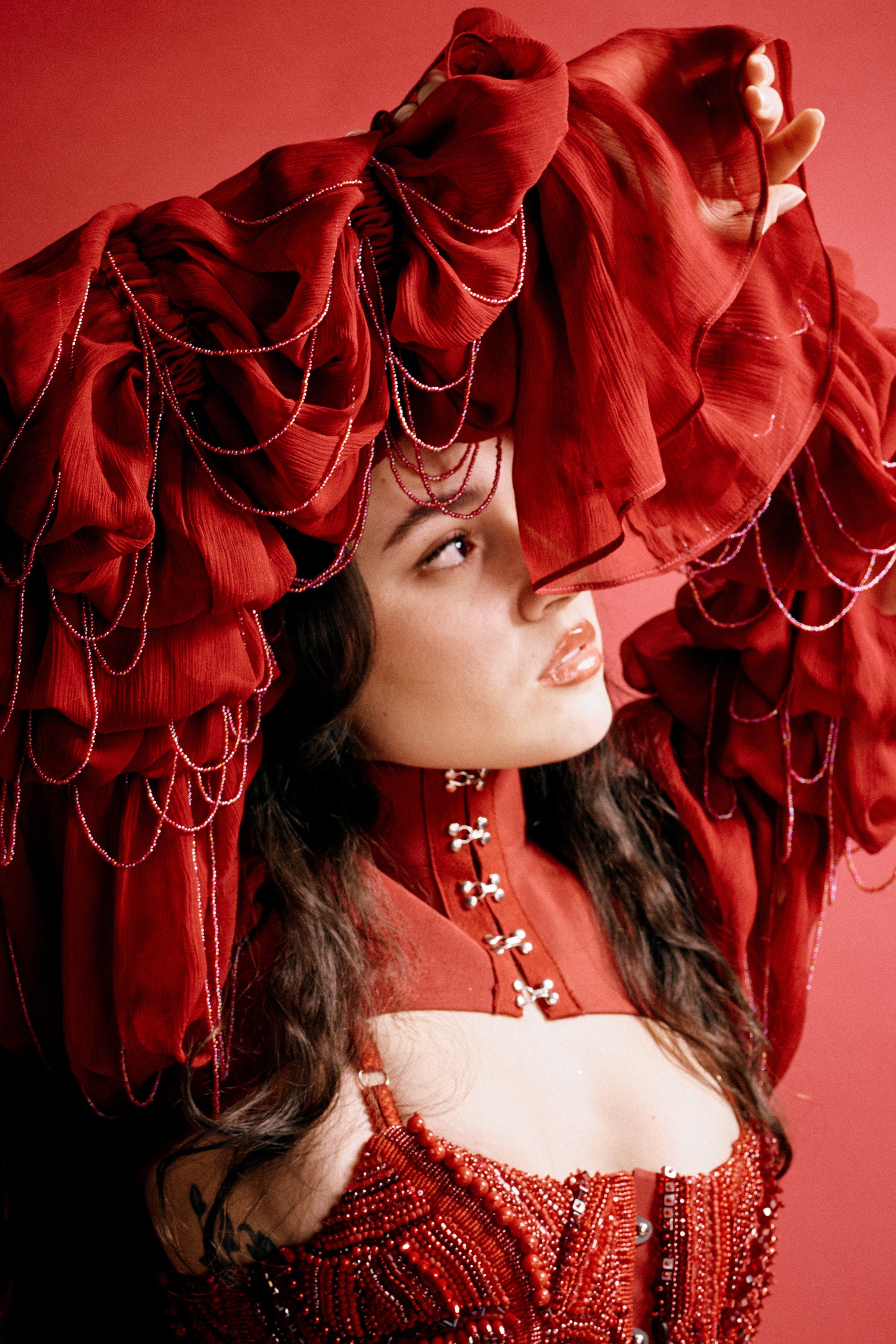 The Bolero is made of blood red silk faille for the bodice and mock neck collar and blood red silk crinkled chiffon gathered in to six puffy layers and a ruffled sleeve cuff. The sleeves are layered in strings of red beads cascading down the arms from shoulder to wrist. It closes in the center front with large hooks and eyes and in the back with silver grommets and red satin ribbon lace up closure down the center back.