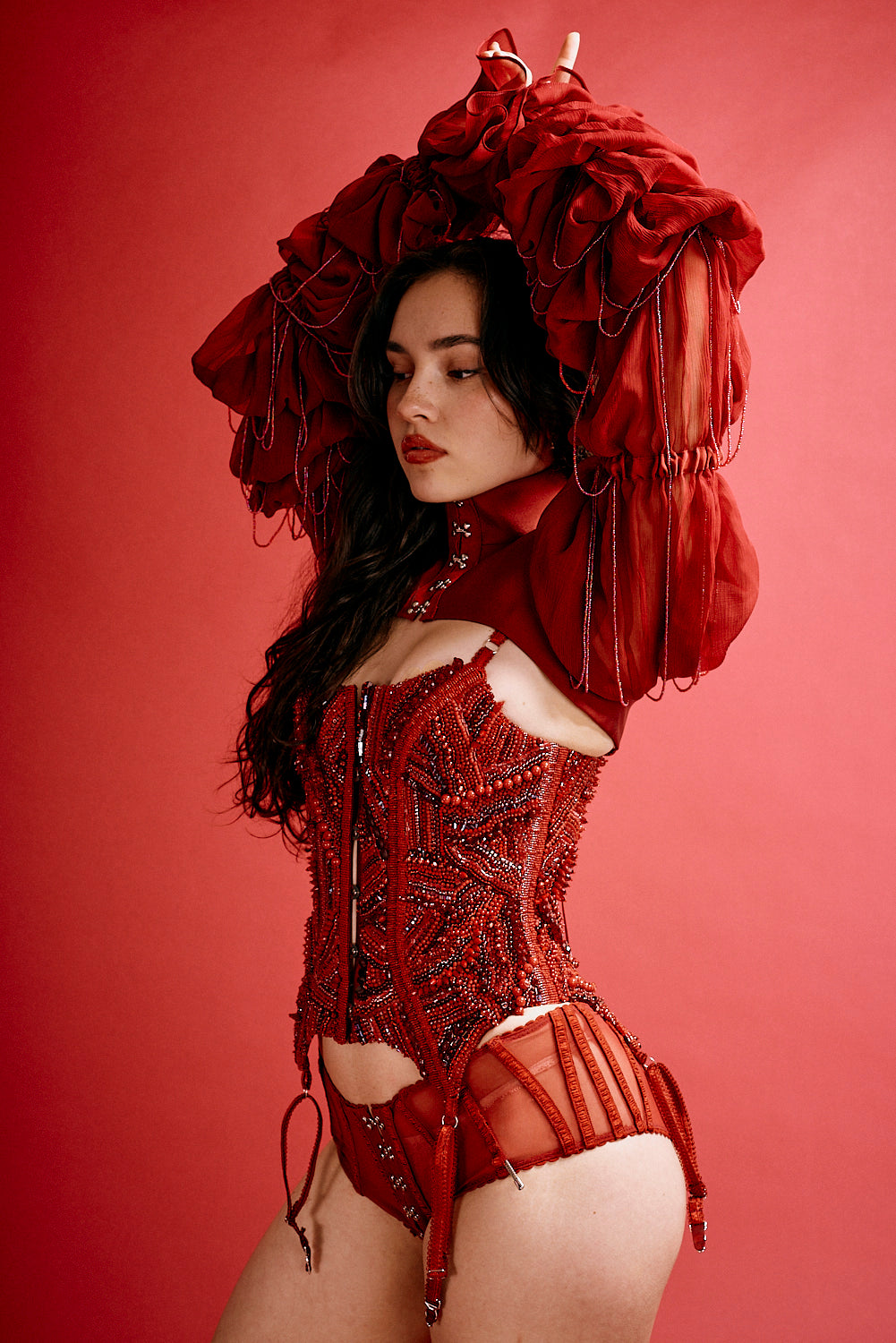 The Caracalla Panty is made from red mesh and closes in the front with silver hooks and eyes. The panels are framed by a red textured elastic and laced up the center back with red satin ribbon.