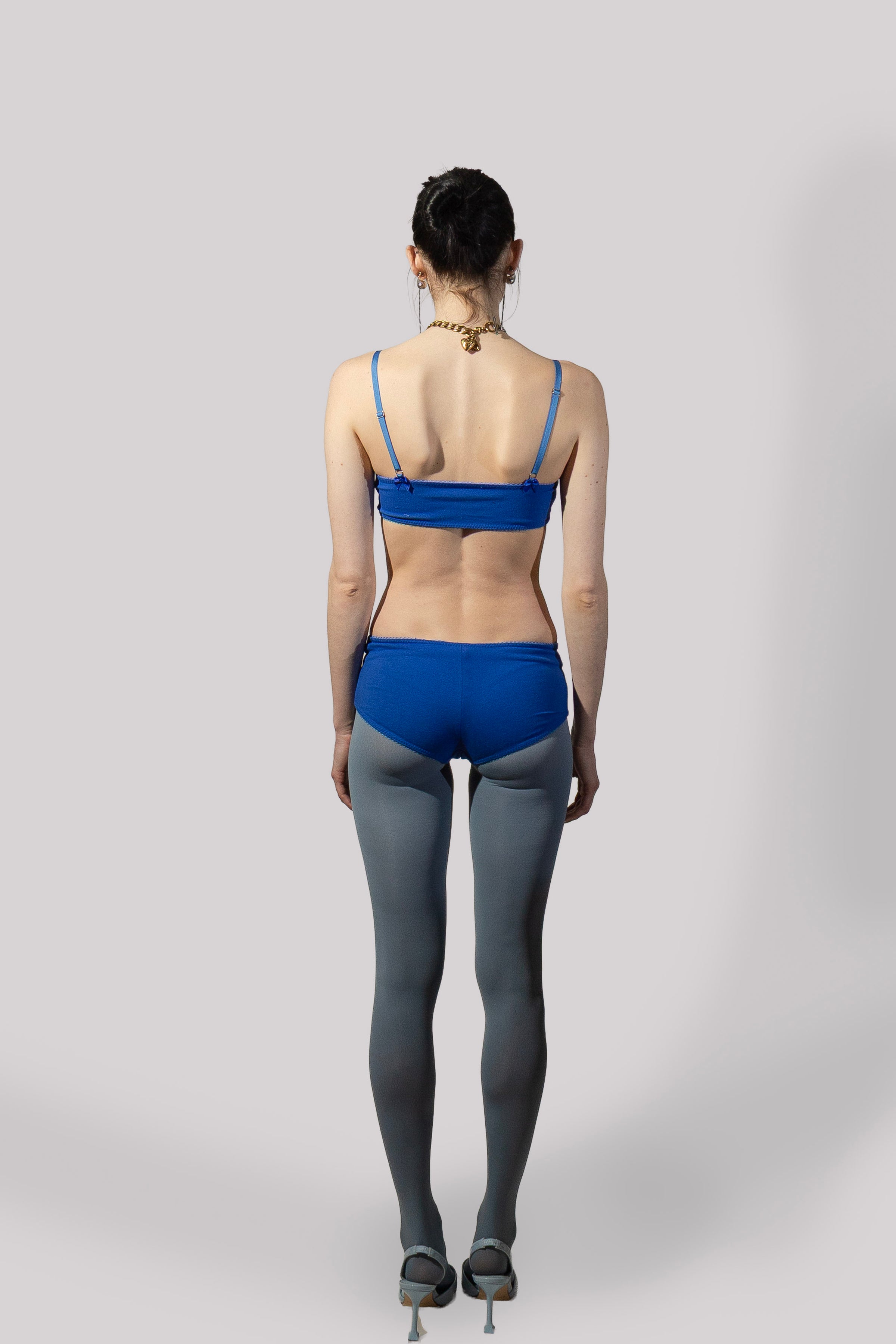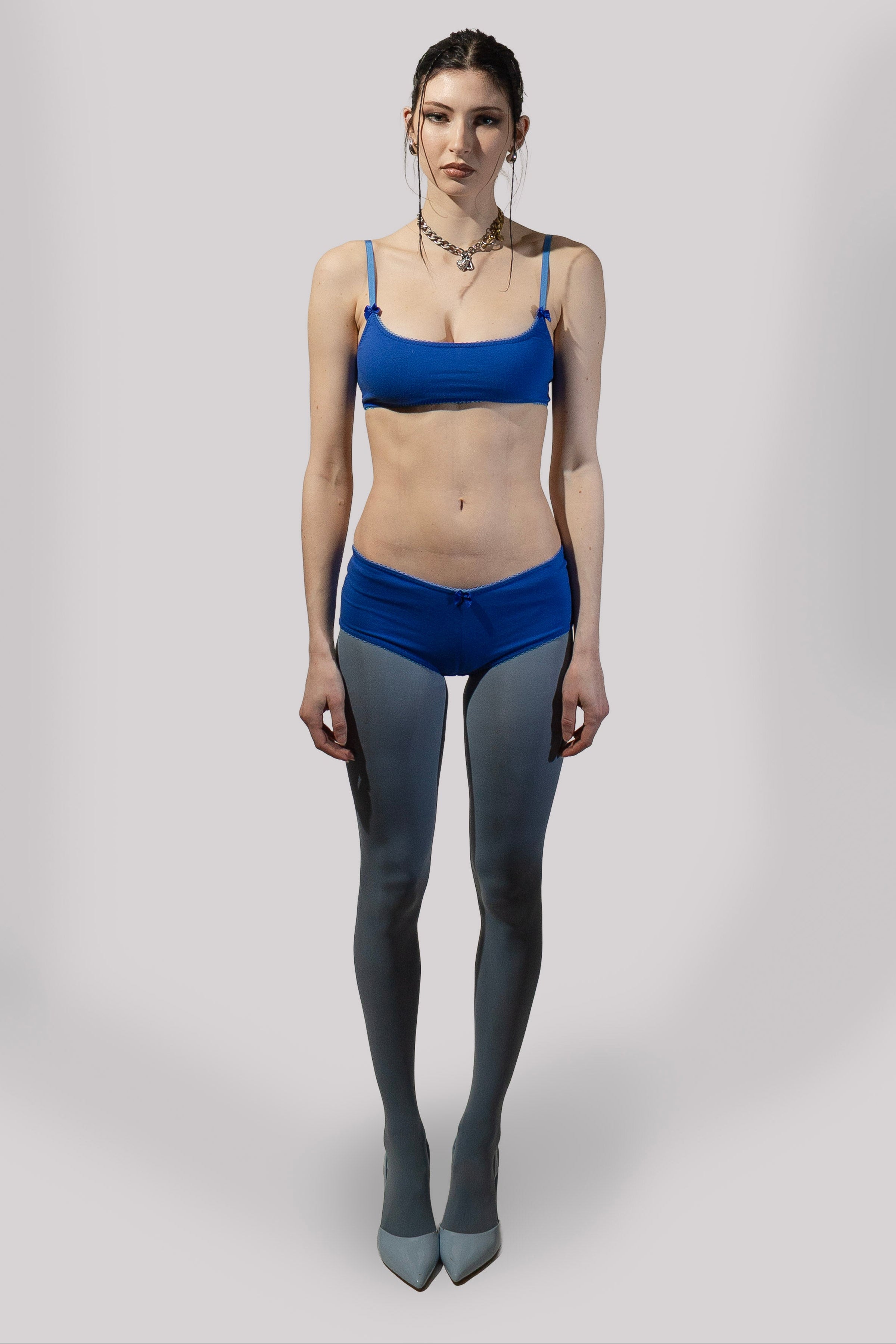 The Jane Boyshort is a panty with a low rise cut and full coverage. The edges are finished with picot elastic for stretch and shape. The center front of the panty is marked with a satin bow. The panty is lined with a cotton jersey patch for comfort and hygiene. The Jane Boyshort is made from a blue cotton/spandex jersey knit.