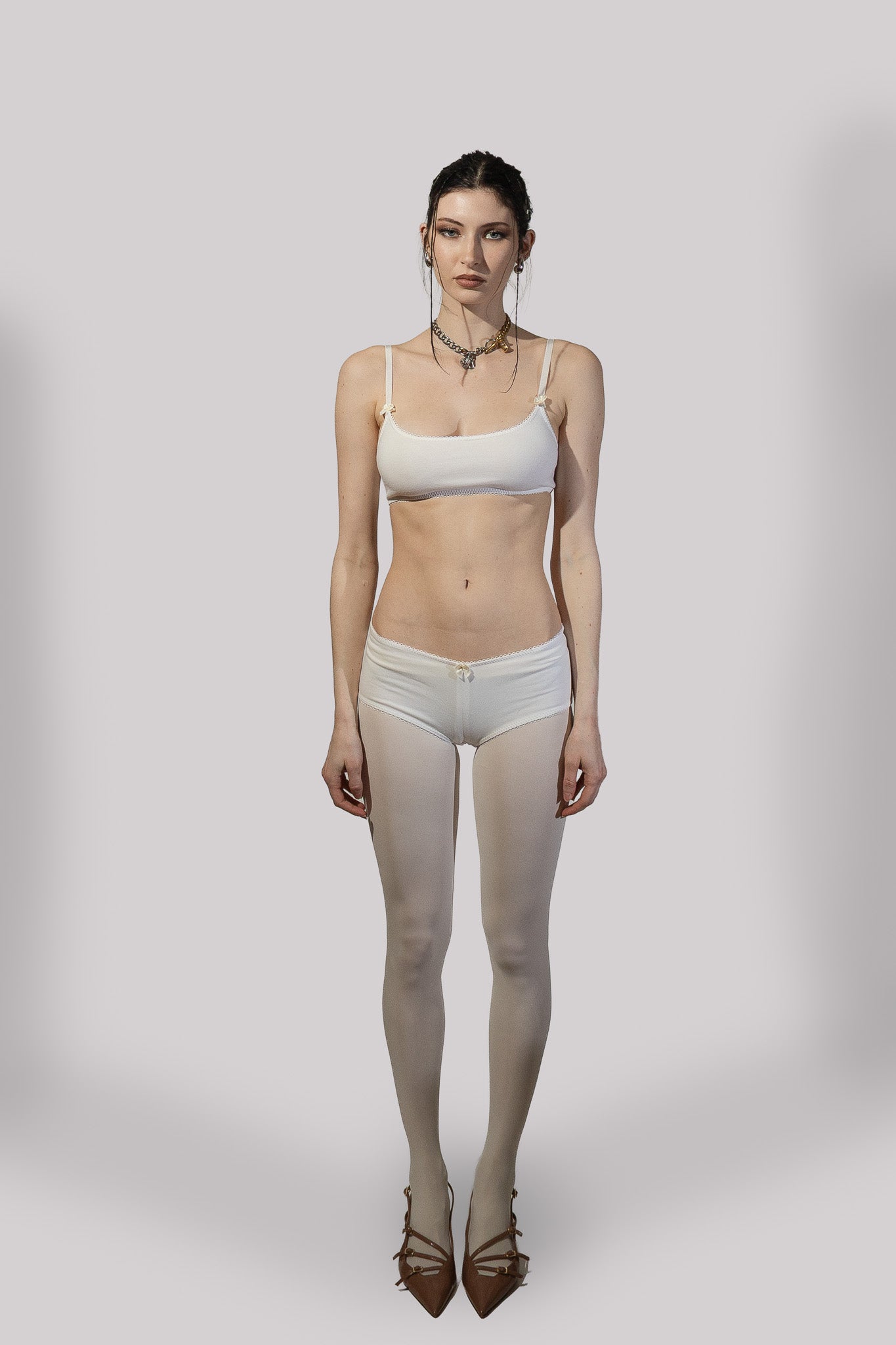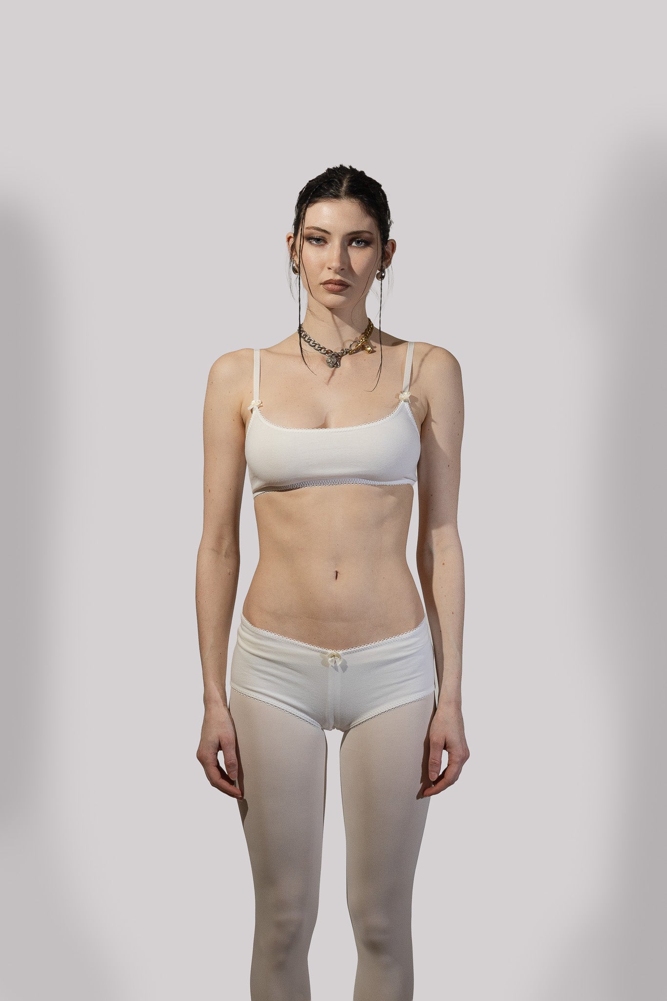 The Jane Boyshort is a panty with a low rise cut and full coverage. The edges are finished with picot elastic for stretch and shape. The center front of the panty is marked with a satin bow. The panty is lined with a cotton jersey patch for comfort and hygiene. The Jane Boyshort is made from a ivory cotton/spandex jersey knit.