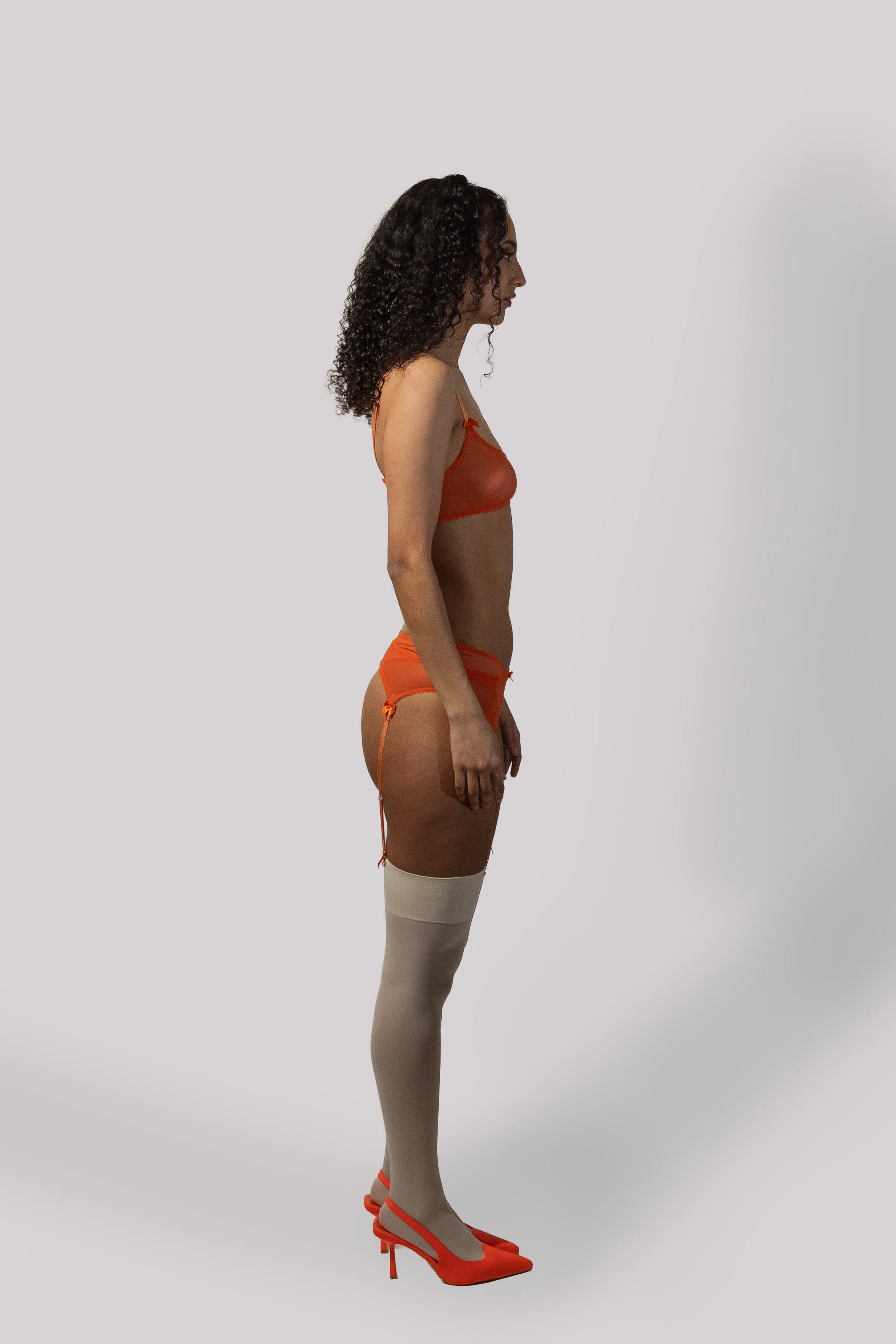 The Jane Garter Belt is a mid rise garter belt with four garter attachments, two in the front and two in the back. The attachment straps are made with silver adjustable hardware. The garter attachments are covered with a satin ribbon and there is a satin bow attached where the straps meet the garter belt. The Garter Belt is made from a orange polyester/spandex mesh.
