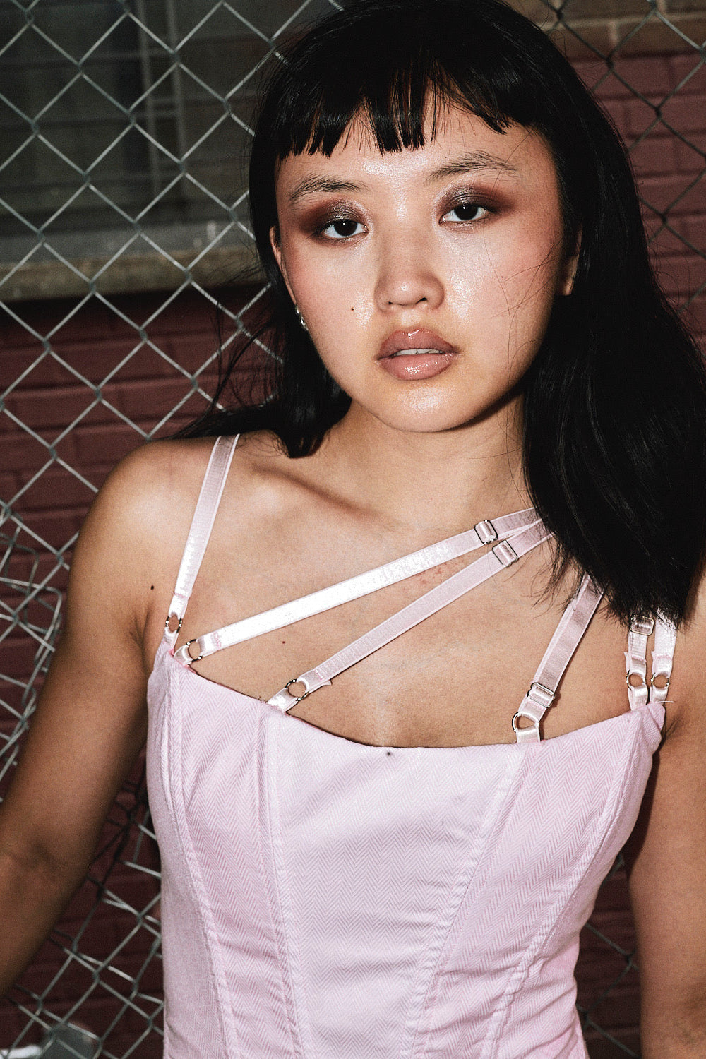The Rebecca Corset is full length with a flattering V shaped waistline. The top has a strappy neckline with 6 adjustable straps across the front and 3 adjustable straps across the back. The corset closes with a lace up down the back through silver grommets with a satin ribbon. The Rebecca Corset is made of pink chevron cotton shirting and lined with pink cotton shirting for comfort and breathability.